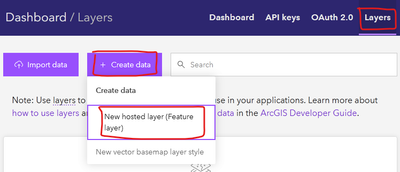 Once on the developer site with an account, you can create a hosted feature layer by going to the Layers section, then + Create data and choosing the New hosted layer (Feature layer) option. The page will then walk you through creating a new hosted feature layer.