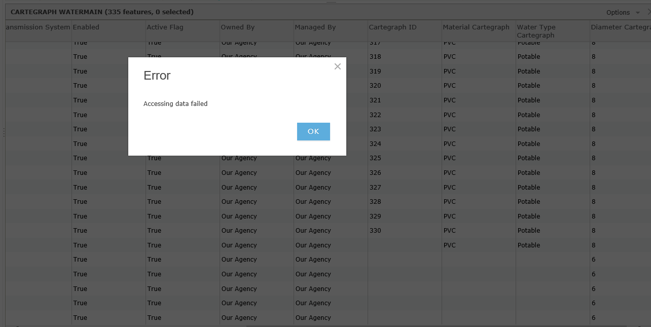 I'm trying to update some fields in one of my hosted feature layers. I opened the layer up in map viewer with full editing control. When I double click a cell to add a value, I get the message below 'Error Accessing data failed':