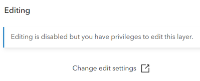 I have a layer that I cannot add to the Edit widget in Experience Builder. When I look at the hosted view layer in the map, it tells me that editing is disabled, however I do have editing enabled on the layer. I'm using ArcGIS Online