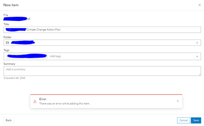 Hello, I am getting an error while uploading a PDF file into AGOL via a local path/choose a file. What could be the issue?