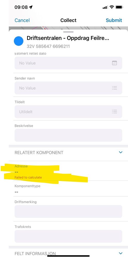 But when I try to submit the form in the Field Maps Mobile App I get the error message failed to calculate, and The Field Maps log gives me this error message:
