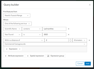 So in the following example, we will find patches of grass where either the scientific name includes 'Lachnanthes' OR the year of the observation is 2022 OR it is within 2 km of a campground: