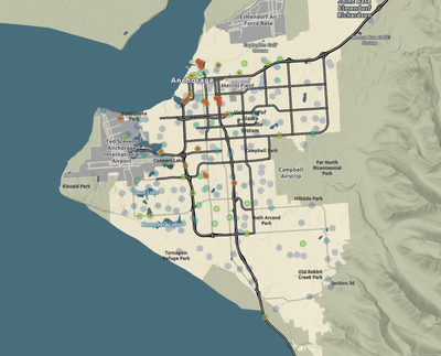 Unfortunately, I run into trouble when I zoom into a specific community, for example Anchorage shown below. I do not like the way the heat map is rendering at this scale, as it takes away from my main message that I want to convey to my audience.