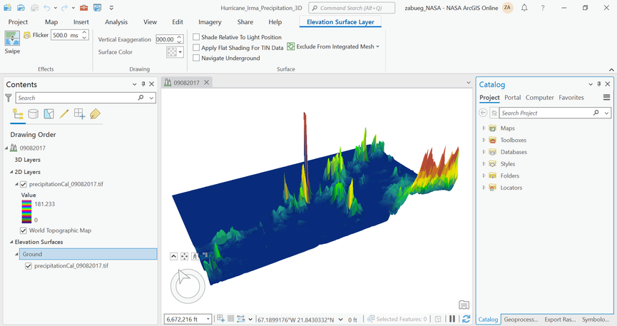I have this local scene in ArcGIS Pro, where I've taken precipitation raster data, made it an elevation source, and vertically exaggerated the ground in order to show the data in 3D.
