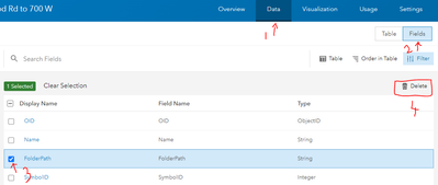 In your item details, go to Data (1). Then click on Fields (2). Click the check box (3) next to the field. Then a Delete button (4) will appear.