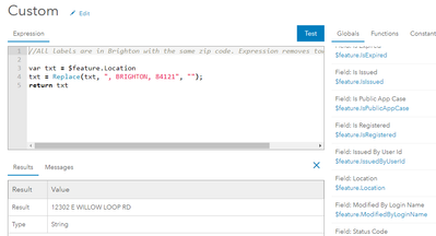 I stumbled upon this thread when I was looking to remove part of a label from a feature field in a webmap. Here's what I ended up with: