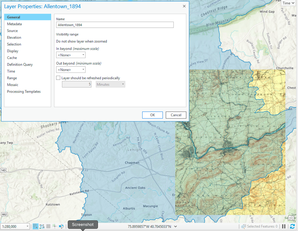 Hi everyone. I'm working with some topographic maps that I brought into ArcGIS Online from the USGS Historical Topographic Map Explorer. I was having issues with them not being visible when zoomed out. I brought them into ArcGIS Pro and had the same behavior. There are no visibility ranges set. Any thoughts? Here's an example - visible at 1:280,000, but not at 1:290,000.