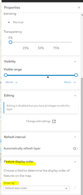 I am trying to utilize the Feature display order option that is found in a layer properties in Map Viewer (see image below). Changing the Order by option has the desired effects; however, after saving the setting and saving the map, the next time I return to the map the Order by returns to 'Default data order'