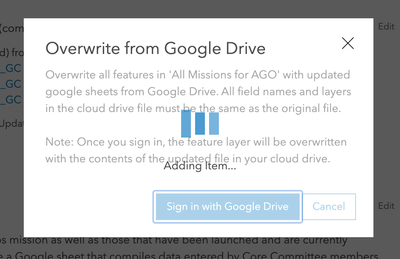 We have a hosted feature service that we update from a Google sheet on a frequent basis (weekly or more often). As of 3/25/22, when I click the Update button, select "Overwrite Entire Layer," and then select my G Suite account, the process begins as expected but then just hangs interminably on the "Adding Item..." screen. Normally this update takes just a few seconds but now we've let it run for hours and it never completes the update or produces an error message.