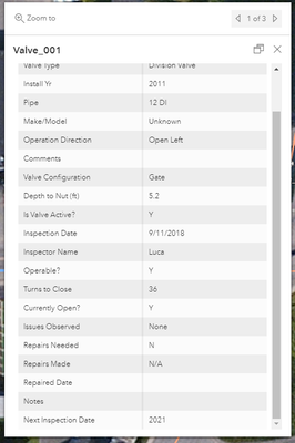 ...but the popup looks like this, showing just one inspection record after the valve data, and including inspection fields that the Arcade expression doesn't specify: