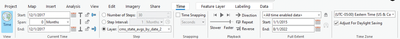 The current time is clearly 12/31/2008 - 12/31/2009, but the slider shows 2009-2010. ???? I don't even know what to make of this. The time settings established in ArcGIS Pro look like this: