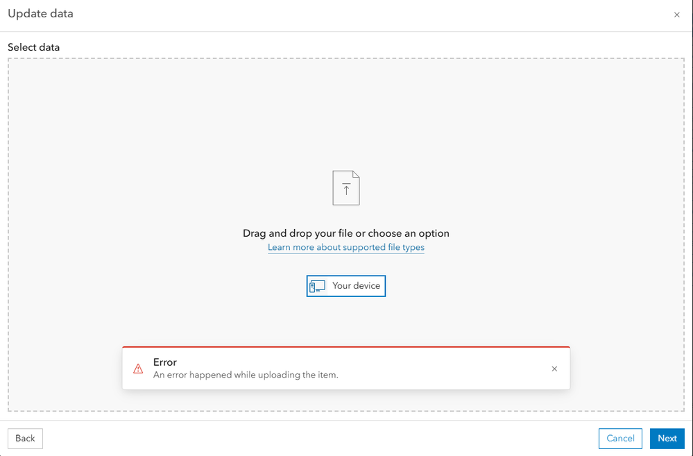 I am trying to update a new feature layer with data from an old layer that is now deprecated. I am cleaning up my content in ArcGIS Online and want to get rid of the old layer (since there are no active forms attached to it), while keeping the data to feed into a larger multi-year map project I am working on. I went through the steps to upload the data into the feature layer to add these data points but am getting this error message below. I've reviewed that I have a compatible file type and that the headers for the field names are the same. Are there other things that I should check that could be preventing this file from uploading and updating the current feature layer? Or is there a different way I should be going about merging this data with the new layer?