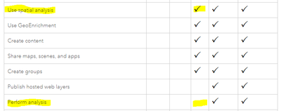 I am studying user types and roles, and came across this. User role can use spatial analysis in ArcGIS Online, but cannot 'perform analysis.'