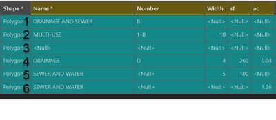 Fields: Name, Number, Width, sf, and ac.