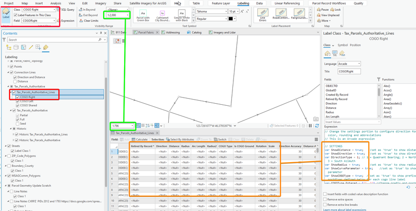 For my parcel lines, I would like to be able to see their out-of-the-box labels. Currently, they are not displaying. Do I have to populated the empty attribute fields in the lines layer (elevation, distance, radius, arc length, etc) to enable the labels to display? If so, what tool do I use to do that? Enable COGO tool? 😬