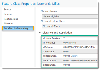 APR calculates the required M tolerance and resolution for the network feature class that will align the XY tolerance with that of the M tolerance in the desired unit of measure. The XY and Z tolerance and resolution for the network will come from the centerline of the LRS.