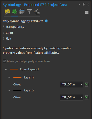 Currently there are capabilities to offset symbols by attributes individually. It would be nice to be able to do it for all symbols in a layer in the "Vary symbology by attribute" pane like you can currently for size/transparency/color. I am maintaining a sign map for all the signs on county roads in 2D. Every time I add a symbol (new sign) I have to redo the offset connections for it.
