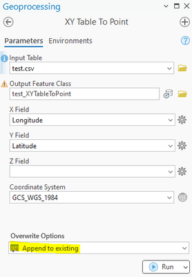 Hi Bud, we are going to mark this idea as implemented in ArcGIS Pro 3.5. As Drew mentioned, several geoprocessing tools have a new Overwrite Options drop-down list when the specified output dataset already exists.  This new option is available in the XY Table To Point tool, and you can use it to "append" the tools output as new rows of data to an existing dataset.