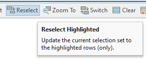 Hmm, it's hard to think of one word that clearly communicates the meaning, so I can see why Esri does not already have a better word here. I think "select" would be good, because "select" says that you're picking the highlighted rows and they'll be blue (rather than yellow) because we know that selected rows are blue. "Reselect" - with the "re" prefix - implies to me that I would be returning to some previous state (instead of going to a new state where the currently selected (blue) rows become unselected), like where the highlighted rows are returning to be a part of the original larger selection, which we know is not what the button means.