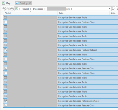 In the Catalog View, I can see a list of the datasets that are in my enterprise geodatabase connection: