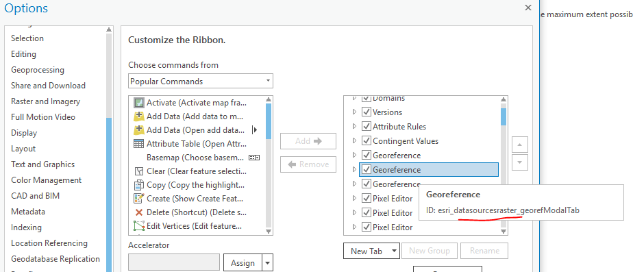ArcGIS Pro has very many tools. They made it easier to find all these tools by only displaying context-sensitive tabs. However, it is very difficult to customize the ribbon because there are so many tools and tabs, which some seem redundant. For example, there are 3 georeference tabs under the "Main Tabs" heading.