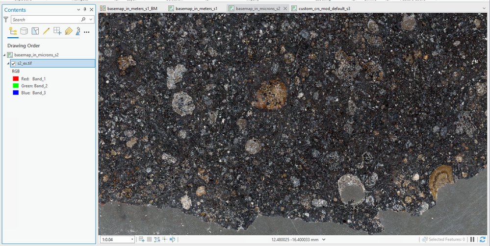 The OSIRIS-REx microscopy data goes down to the nanometer scale, but unfortunately, ArcGIS Pro and the Map Viewer tool do not currently support the visualization and measurement of data with a sub-centimeter resolution. Beyond the centimeter scale, both tools cease to permit zooming-in. Further more, when looking at coordinates or using the measure tool, the smallest metric unit available is meters and the precision is limited to 2 decimal places. This means any value smaller than 1cm is just reported as 0.