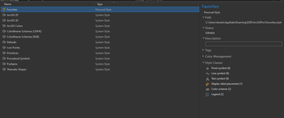 My idea: get rid of this, err, unique system and make it work like every other catalog folder. Double-clicking on a style, such as your favorites, would open up like a folder containing the child style classes (such as point symbol, color scheme, legend); double-clicking one of the child classes would show you the component styles. The tree in the contents pane could also expand each style to show the classes and make navigation easier. Double-clicking on one of your styles again would show the folder with all child style classes as you would expect rather than doing what it does now, which is show only the last subclass you chose. The 'Manage Style' right click option could be retained and given functionality: it would open up a pop-up Properties box that contains the path, status, description, and tags elements, or these things could be kept in the metadata/details pane as they are now.