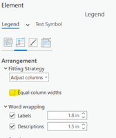 I'll link this exact same idea from 2020.  Not sure I'd call it an idea, more pointing out broken functionality.  Formatting Legends in Pro is a nightmare.  Specifically adjusting column widths in relation to text size, element size, etc. The knobs simply don't work.  "Equal Column Widths" check box does not function.  Fitting Strategy options to anchor Font Size, Column Width, etc. don't fully work either.  We need the ability to create legends that don't look like the below screenshot (notice all the white space between column 2 and 3).