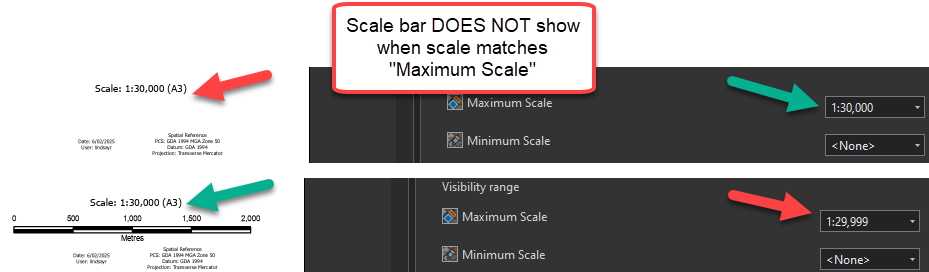Hi @JesseWickizer. Yesterday I ran into a small "bug" with the new scale bar visibility features. I'd spent some time creating a set of 3 scale bars with different Visibility ranges (<1:10000 / 1:10k - 1:30k / >1:30000). For the middle interval, I had the scales set to 1:10001 - 1:29999 with the upper and lower bars set to the round 1:10000 (Min) & 1:30000 (Max) values.