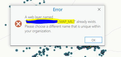 we are facing pain when we are trying to update web map content through the ArcGIS pro but we are getting the following warning "A web layer named “xxxx_MIL1” already exists. Please choose a different name that is unique within your organization".