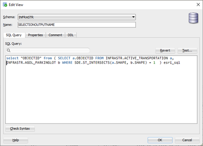 INFRASTR.AGOL_PARKINGLOT b WHERE SDE.ST_INTERSECTS(a.SHAPE, b.SHAPE) = 1 ) esri_sql
