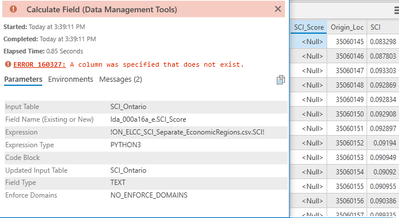 2. Then I thought, ok maybe I can create a new field in the selected layer, and update it with the information from the csv table. I get the message below saying the column specified does not exist!! Well, I am updating SCI_Score column based on SCI column coming from the csv table; both columns have Double type. They are clearly both there in the joined up layer.