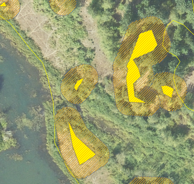 Also, I am unclear - do you need to itemize per rhizome buffer as with Dan's response, or just a single acreage for the total area? My interpretation of your question is that the buffers overlap, and that all you need is the total area of a dissolved buffer. If that's the case, it's much easier.
