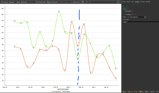 I thought it would be interesting to add a vertical guide to a chart to show a point in time when some changes that were made so end users could look at the chart and easily identify the 'before' and 'after' periods.. however when i add a vertical guide set to that date in this chart (approx where i added the dashed line), nothing is added. Maybe I am misunderstanding this capability. Thoughts?