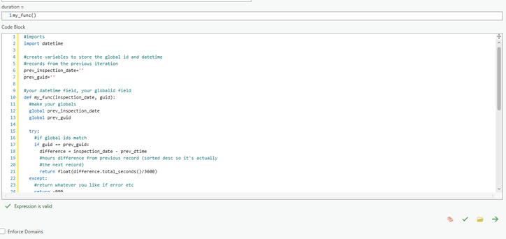 prev_gid = gidAfter you run this (obviously create a new float field to calculate into) you could also then summarize by GUID attribute and get the totals (definition query or filter out any 'open' values first e.g. 'FIELD LIKE 'Open')
