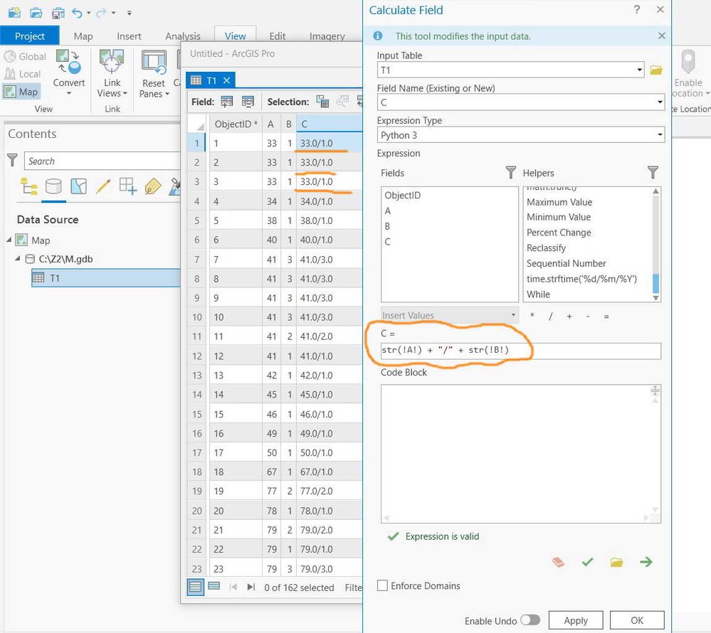 This expression is supposed to combine the field A and field B in field C. The first value in the C table when computed is assumed to be 33 / 1