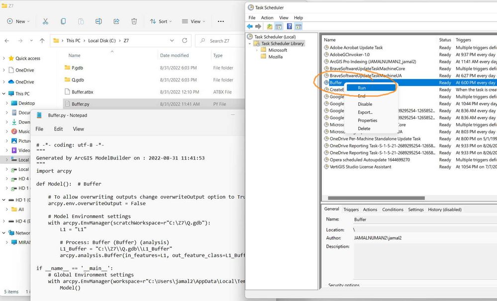 All what I wanted here is to run the buffer tool by windows task scheduler. The python script is extracted from the model. It runs successfully thought the Pro as per the screenshots below.