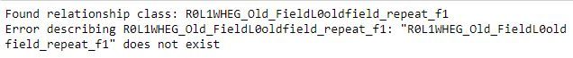 For more context, the feature layer is named WHEG_Old_Field, the related table is displayed as oldfield_repeat_f1: