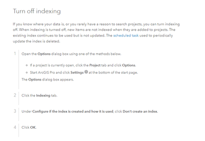 Many users in our organization are getting this error often now with various install versions of ArcGIS Pro in a Windows 10 environment. One of our users has traced the problem to ArcGIS Pro's indexing service and disabling it seems to fix the problem (see his findings quoted below). The instructions for disabling it are described on this page about two-thirds of the way down (also see attached graphic). Disabling it seems to have solved the problem for my Pro 2.9.2 install where I had been getting the popup often. It's unclear if this is an optimal option as folks with larger projects could benefit from indexing, and unclear if just unchecking the "Update the index periodically" provides the same solution while retaining some index benefit, but at least the popup is stopped for now. Esri staff - any insight on if this is the best solution to this problem?
