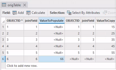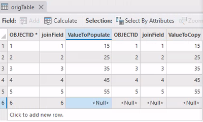 In this example, I've joined the destination table to the origin table based on the "joinField" field. I want to populate the "ValueToPopulate" field in the origin table with values from the "ValueToCopy" field in the destination table.