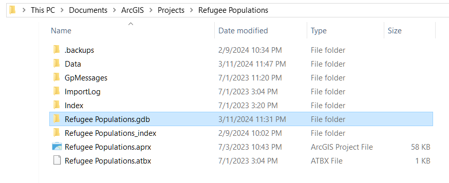 In the example below I copy the "Data" folder and paste it inside an existing Arc GIS project folder ("Data" inside "Refugee Populations") or I paste the project folder "Refugee Populations" into Documents>ArcGIS>Projects.