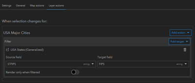 In the map's settings, I can add an action to filter the states when the capital city is selected, because they share a FIPS code in their attribute tables.