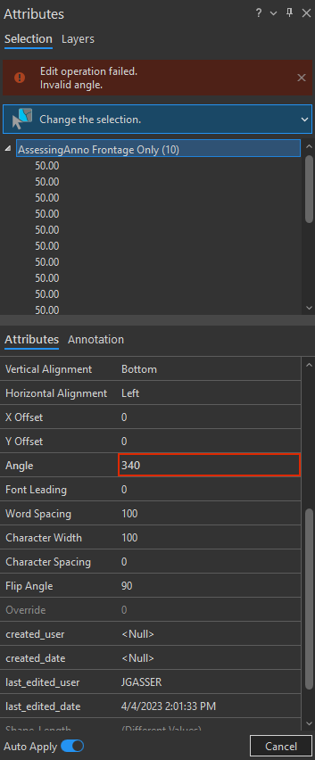 With frontage types selected, and the Attributes pane open, the Angle value is always 0, regardless of the actual rotation. I can rotate the features using the Move editing tool, or by changing the Angle value. The Attributes pane has two tabs, Attributes and Annotation, both of which allow for changing the Angle value. If I do so using using the Annotation tab, the angle of the features appears to change, but the Angle value reverts back to 0. If I do so using the Attributes tab, an error message appears saying, "Edit operation failed. Invalid angle."