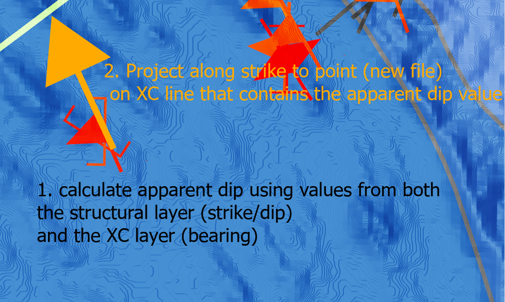 The point values containing apparent dips should all lie on the cross section line. I can stylize the points as a line with the anchor point on the cross-section line. I can make a new attribute which would add the bearing of the XC line to the apparent dip, so that the reference angle is the line instead of 0. Then, I can use vary symbol by attribute to display the dip on the cross section line.