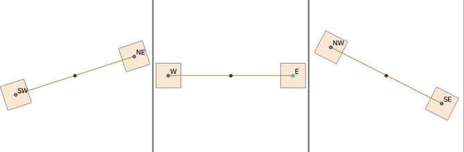 This takes the angle of the line (say, 45 degrees) and then assigns the quadrant (NE). It then inverts that to get the opposing quadrant (SW). The code is set up so that if the line is perfectly north-south or east-west (90 degrees, 180 degrees) then those labels will be "N" and "S" or "W" and "E", without the secondary direction. Let me know if something doesn't work!