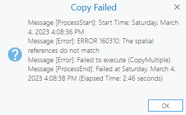 When I try to copy the destinations point feature class to the feature dataset, I get the following error. The message is clear, but why is this happened? The CRSs match.
