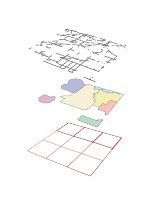 I achieved this by exporting each layer as a separate .png and arranging them in Illustrator. If you don't have access to Illustrator another way is to create the number of scenes you need (in this case 7x local scenes) insert the map frames in a single layout and export them to the file type of your choice. The fishnet polygons in the hospital and school layers will need to be generated with geoprocessing tools.