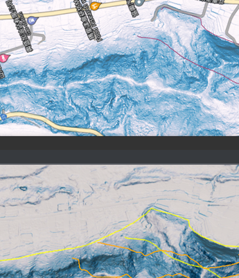 The picture shows that my feature(yellow line in the lower part of the picture) is not displayed in Map(purple line in the upper part of the picture) but displayed in the Scene(yellow line in the lower par tof the picture)