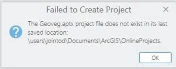 When creating a new project (Project A) from a project template from ArcGIS Online in the ArcGIS Pro start screen, some of the testusers got this errormessage