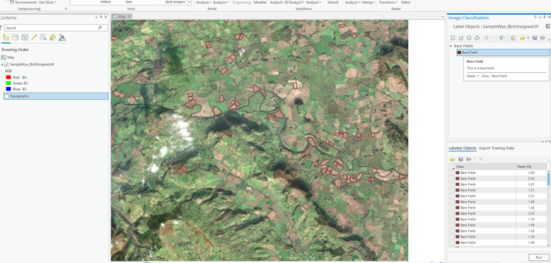 2. I select the raster in the TOC, and use the labels objects for deep learning to draw around 70 polygons, as you can see they have a class value of 1. I only draw polygons around what I think are bare fields. Is this too little or inappropriate for pixel classification?DuncanHornby_0-1626865564396.png